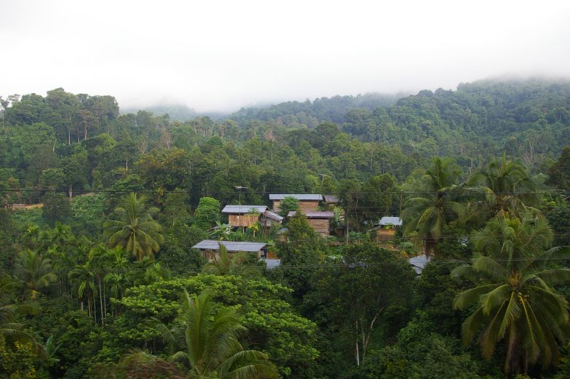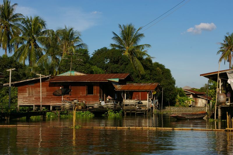 Typowe drewniane chaty, wszystkie na palach.