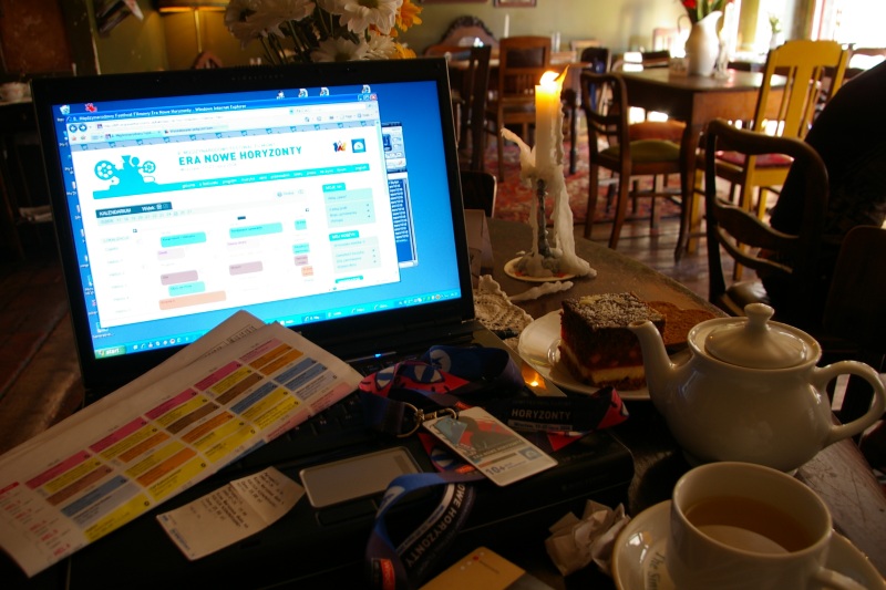 nie, może tym razem ciasto z galaretką wiśniową.. na pierwszym planie niezbędnik każdego eronowohoryzontowca.. laptop, program festiwalu, karnet 10+, bilety, książki, pogniecione papierki z kieszeni itp.